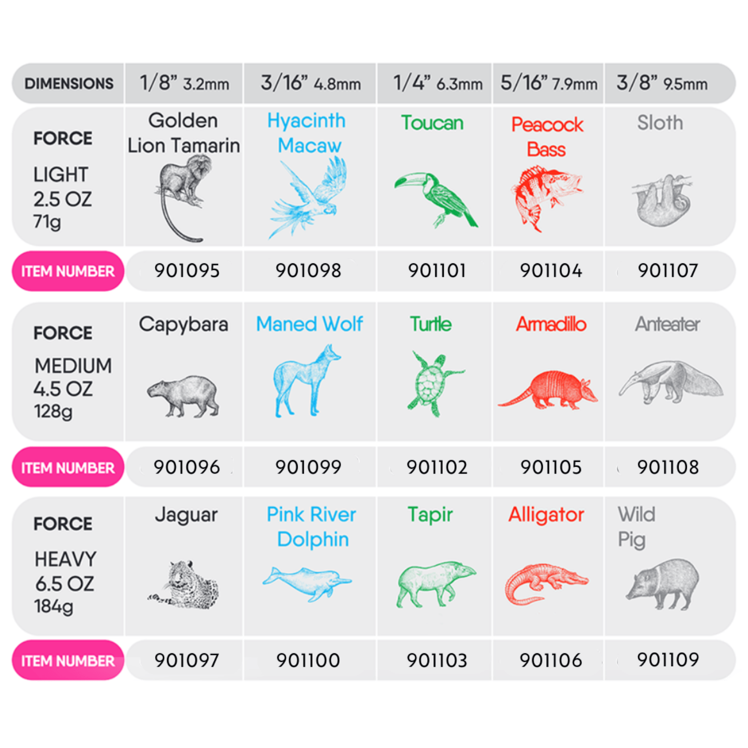 Size Identification: Sizes and strengths are associated with Brazilian fauna for easy recognition.